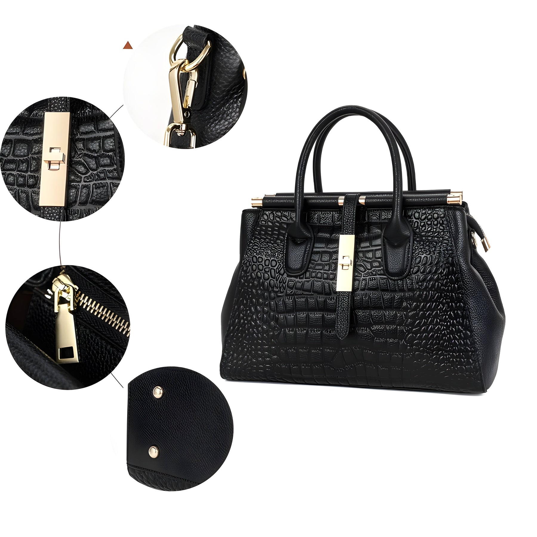 L'élégance rencontre le raffinement dans ce magnifique sac à main, confectionné en cuir de veau embossé imitation alligator. Son design structuré allie modernité et intemporalité, tandis que la fermeture magnétique dorée crée un contraste audacieux avec la finition noire élégante, renforçant ainsi son attrait chic.